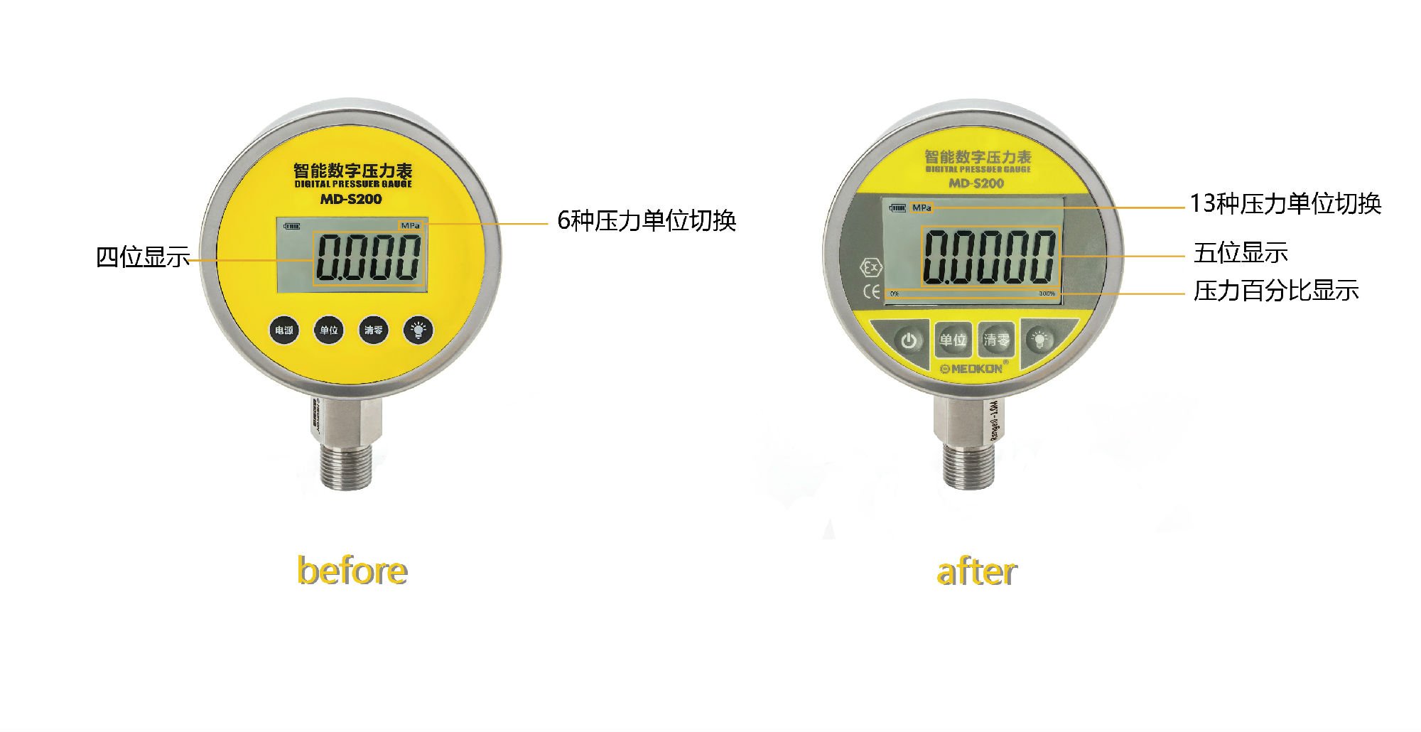 為了給大家提供更好的產(chǎn)品和服務(wù),我司對(duì)MD-S200智能數(shù)字壓力表進(jìn)行了功能參數(shù)和性能升級(jí) 。從2018年8月1日起如無特殊要求將開始供應(yīng)升級(jí)后的產(chǎn)品,新產(chǎn)品在使用上可以完全替代上一代產(chǎn)品。